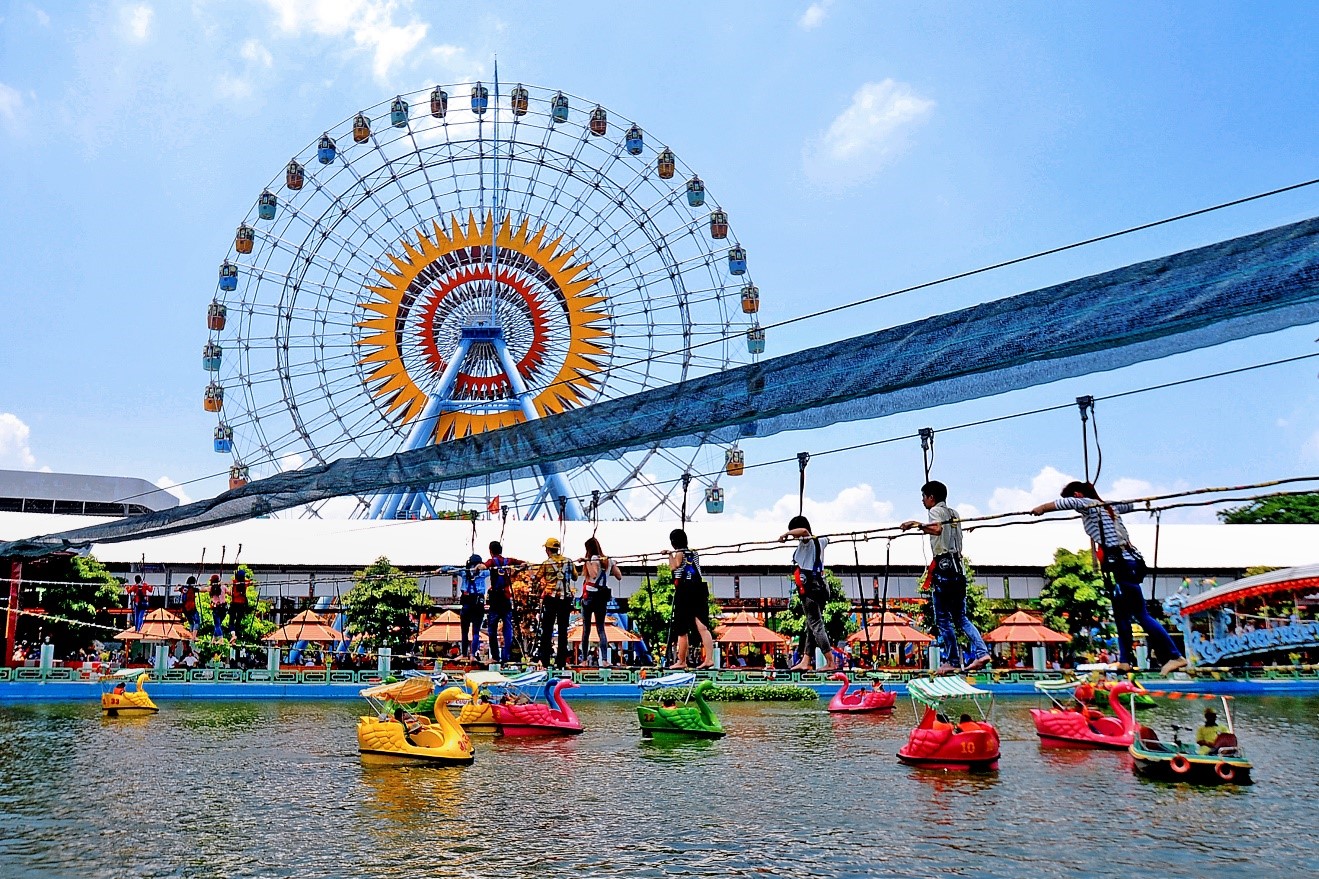 + Vui chơi mạo hiểm vừa: Những trò chơi vận động vui nhộn như Xe điện đụng, Phao đụng (30.000 VNĐ); hay cảm giác bay bổng với Ghế bay, Vũ điệu Tagada và Đĩa Xoáy Thiên Hà (đồng giá 20.000 VNĐ).